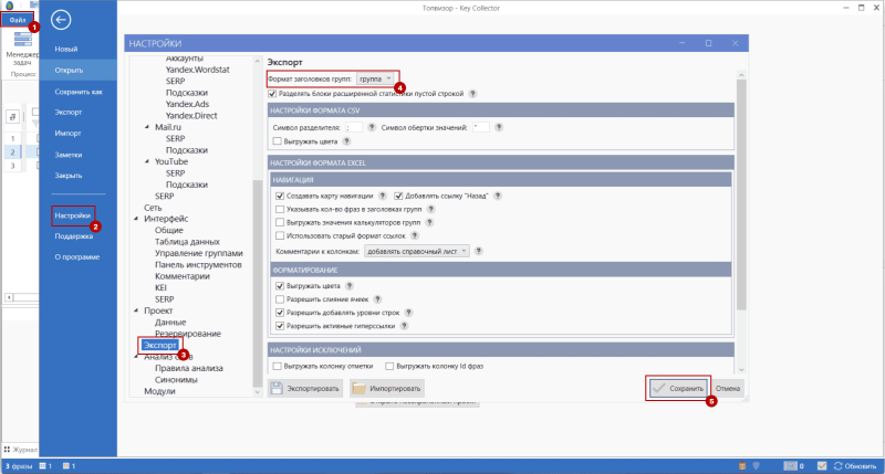 - Откройте проект в Key Collector и настройте экспорт групп. Для этого перейдите в меню Файл → Настройки, в левом меню выберите Экспорт. В строке Формат заголовков групп выберите пункт группа:
