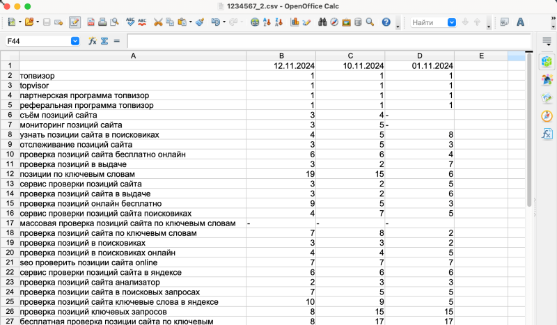 - Откройте файл и удалите из него лишние данные, оставьте только запросы и позиции. Запросы должны быть в первом столбце, а клетку А1 оставьте пустой. Остальные столбцы нужно переименовать на даты проверок в формате дд.мм.гггг: