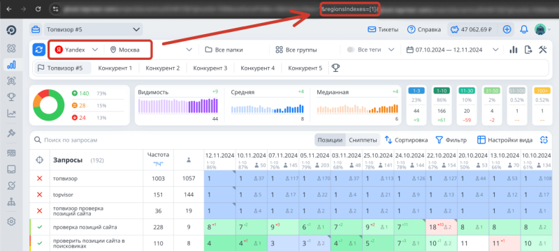 - Переименуйте файл с позициями, экспортированный по этой инструкции, в формате projectID_RegionIndex, например 1234567_1. Индекс региона (RegionIndex) и ID проекта (projectID) можно увидеть в адресной строке проекта в Топвизоре: